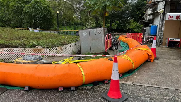 「樺加沙」引致的風暴潮可能會令本港沿岸水位上升。為應對可能出現的水浸,渠務署在大埔普益里設置臨時充水式擋水壩。(發展局網頁)