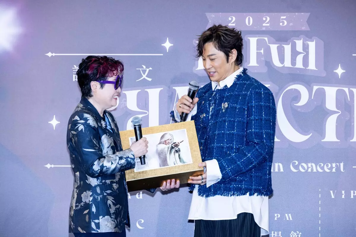 而主辦單位天星娛樂陳淑芬陳太帶來一份很有意義的禮物,陳太說:「我和阿譚結縁於風雲音樂劇,在劇中阿譚飾演無名這位世外高人,我特別把他在劇中所穿戴的這對手腕護甲送給他,去年我在澳門舉辦的50周年紀念展中,也曾在現場展覽這對護甲。我和阿譚合作時他真的很勤力,很佩服他的堅持和努力,加油。」