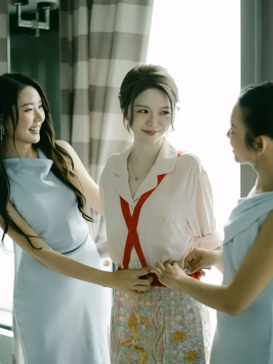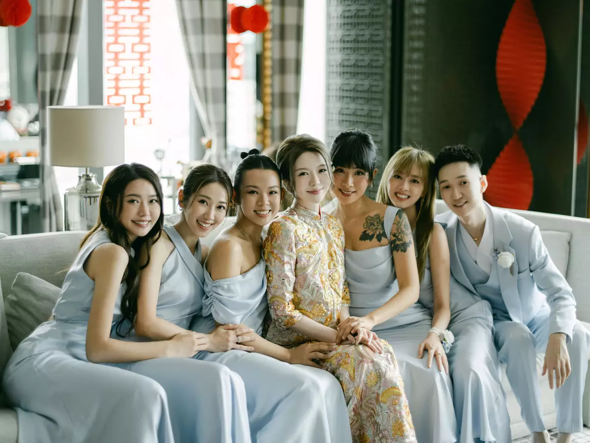 相中可見,新娘子曾樂彤在兩位姊妹戴祖兒及蔡明思協助下穿上裙褂,一身金碧輝煌的褂皇,貴氣而且氣派十足;而一向予人感覺性格沉穩的徐浩在宣讀愛的宣言時,竟然比老婆更早喊,搞到曾樂彤都忍不住笑了出來,畫面有愛又溫馨!