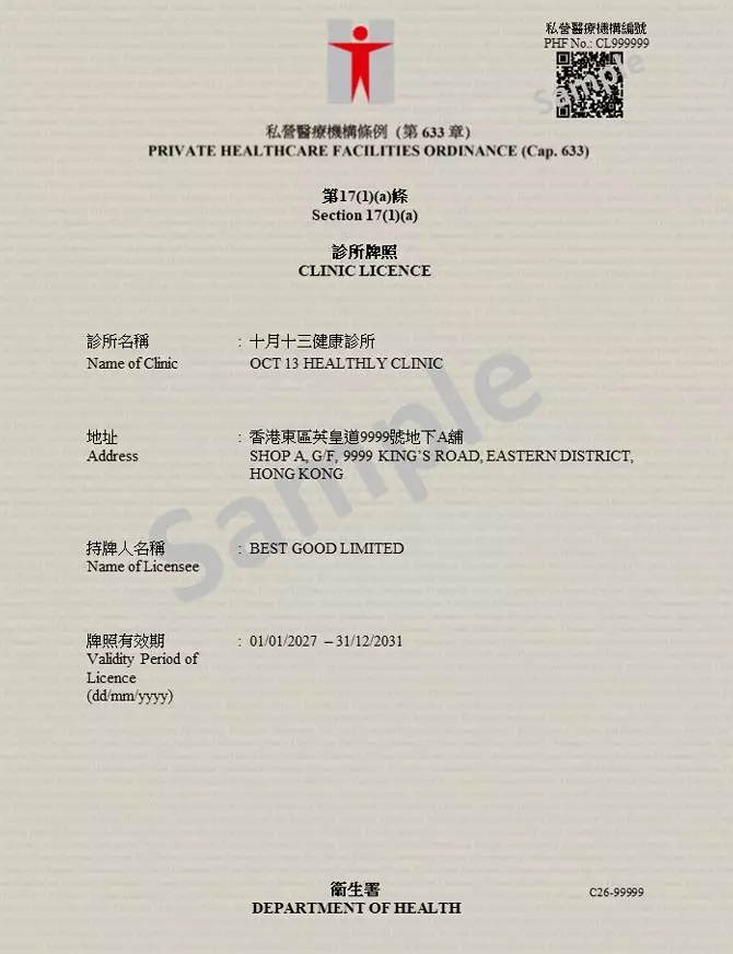 診所牌照的樣本。為方便市民識別已獲得牌照的診所,市民只需掃描牌照右上角的二維碼,即可連結到私營醫療機構登記冊,了解診所是否已獲牌照。政府新聞處圖片