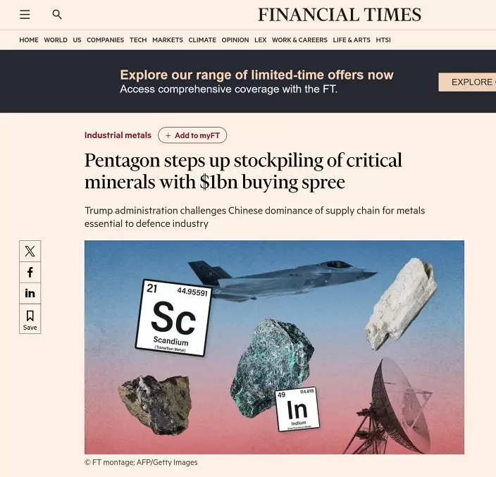 《金融時報》指,關鍵礦產是五角大樓的國家安全重點,因它們對幾乎所有武器系統、以及雷達和導彈偵測系統等技術都至關重要,特朗普政府對關鍵礦產的關注,國防部近期的儲備活動明顯加速,五角大廈甚至正尋求採購一些此前並未被儲備的金屬。