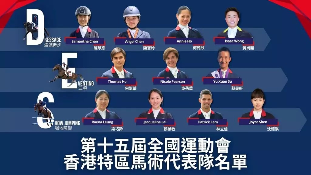 所有代表隊成員均受惠於香港體育學院及馬會馬術精英計劃的精英訓練資助,接受專業培訓。值得一提的是,本屆代表隊中有五位騎手首次亮相全運會,包括:陳萃彥、陳寶玲、黃尚頤、蘇昱軒及沈憶淇,他們均來自馬會青少年馬術發展計劃,展現香港馬術新世代的非凡實力。