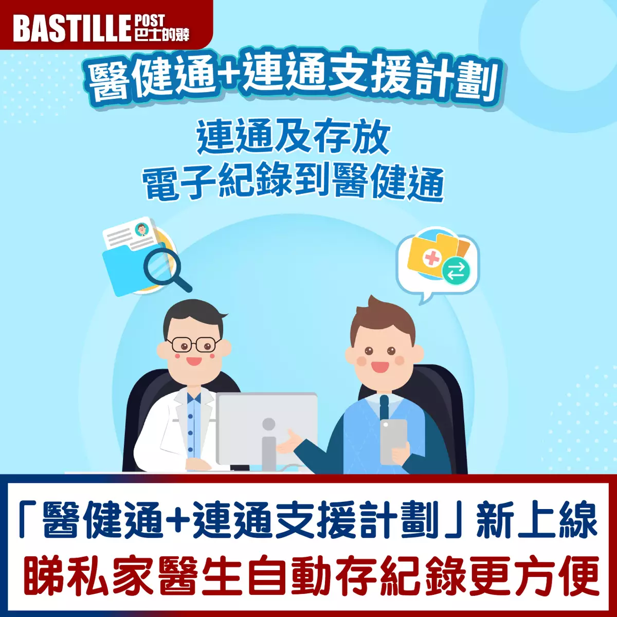 醫務衞生局宣布,星期二起推出「醫健通+連通支援計劃」,鼓勵私營醫護提供者採用已連通至醫健通的臨床醫療管理系統,將市民的醫療紀錄存入他們的個人醫健通戶口。醫衞局亦會同日推出「醫健通+連通認證計劃」,方便市民辨認及選擇已連通至醫健通,並可為他們存放醫療紀錄的醫護提供者,協助市民建立整全的個人電子健康紀錄。