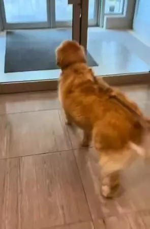 黃金獵犬以為外出散步,興奮衝出門才知要去沖涼瞬間拒絕前進。影片截圖