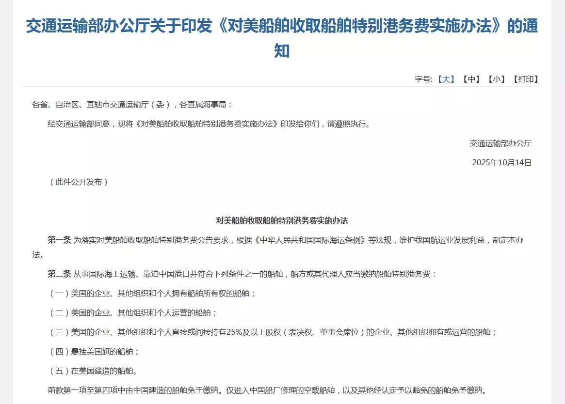 交通運輸部印發通知,指示各地交通運輸廳及直屬海事局,根據《中華人民共和國國際海運條例》等法規,為維護中國航運業發展利益,10月14日起實施對美船舶收取特別港務費。