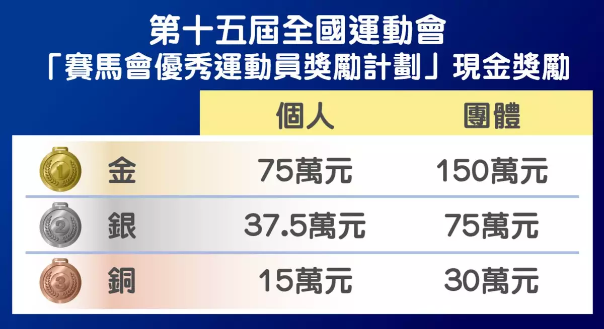 全運會每四年舉辦一次,是國家最高級別及規模最大的綜合運動會;而今年的十五運會由粵港澳三地首次共同承辦,意義非凡。為進一步支持香港特區運動員及推動體育發展,馬會將為十五運會個人及團體項目勇奪金、銀、銅牌的港隊代表頒發現金獎;其中個人及團隊項目金牌的獎金,分別為75萬港元及150萬港元。