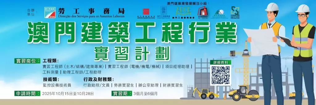 為培育澳門青年投身建築與工程行業,以促進本地人才梯隊的建設和可持續發展,勞工事務局聯同由澳門建築師協會、澳門建築置業商會、澳門工程師學會、澳門工程顧問商會、澳門建造商會及澳門建築機械工程商會組成的「澳門建築業發展關注小組」合作,推出「澳門建築工程行業實習計劃」(下稱「計劃」),該計劃於10月15日至28日接受網上申請,實習名額有限,有意參加計劃的澳門青年申請從速。