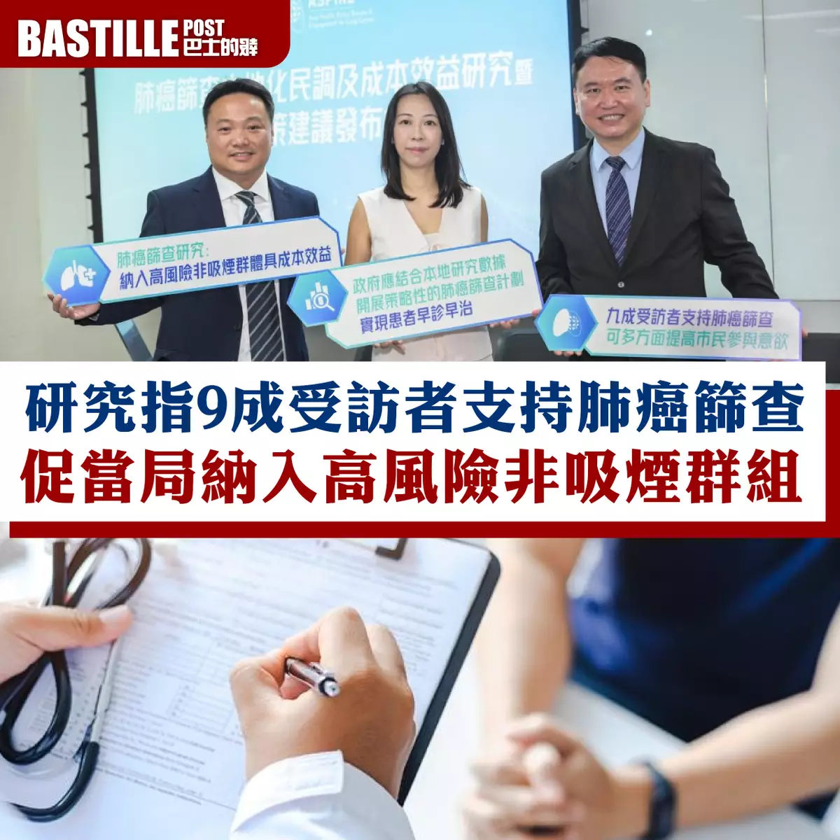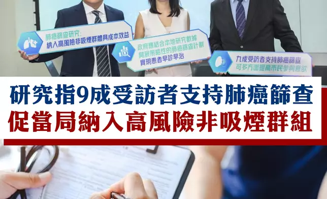 有本地研究指出,9成受訪者支持肺癌篩查,促請當局精準釐訂高風險群組,包括納入高風險非吸煙群組,推進有效的政府主導肺癌篩查,實現肺癌早診早治,提高治癒率。
