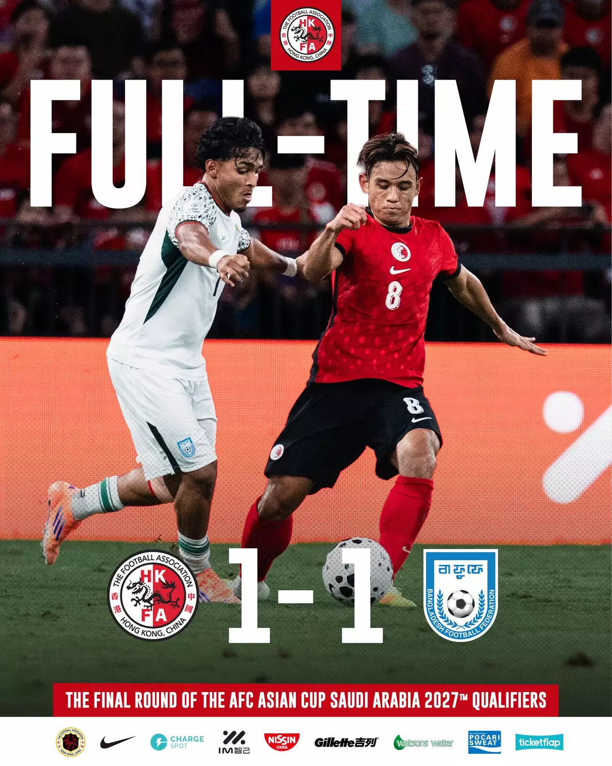 亞洲盃外圍賽C組賽事,港隊在啟德主場館被孟加拉逼和1:1。HKFA FB圖片