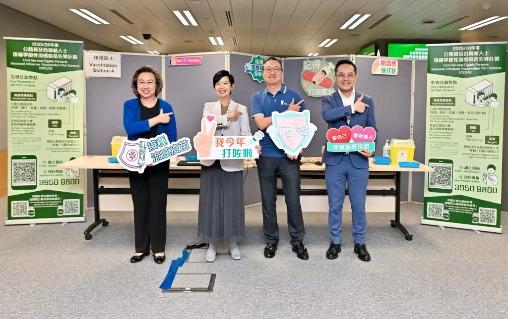公務員事務局聯同衞生署今年繼續推行公務員及合資格人士接種季節性流感疫苗先導計劃,並首次以試點形式,在指定政府辦公大樓提供外展接種服務。約110名公務員及合資格人士上午在政府總部透過外展站接種流感疫苗。