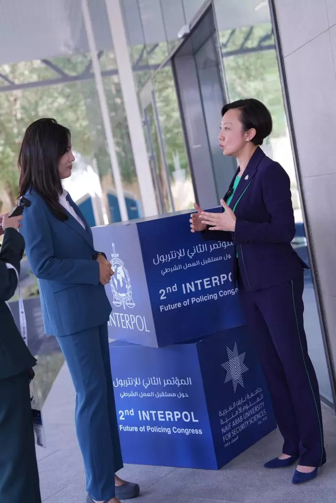 會議期間,香港警務處代表團分別與巴西、印尼、印度、西班牙、法國、荷蘭、意大利、愛爾蘭、德國等執法機構代表進行交流。同時,代表團應主辦機構納伊夫阿拉伯安全科學大學邀請,參觀該校的科技罪案及科技鑒證中心,以及人工智能執法中心。其間,代表團了解當地如何運用人工智能及無人機技術使執法工作現代化,展示沙特阿拉伯邁向智慧警政方面的最新發展。