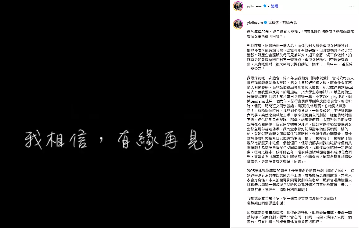 他在社交平台公開表示尋找一位20年前在《獨家試愛》試片現場落淚女學生。