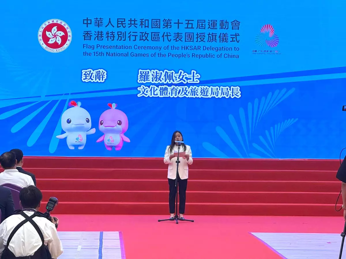 文化體育及旅遊局局長兼香港特區代表團團長羅淑佩在儀式上致辭時表示,距離十五運會開幕只餘下25日,香港賽區的競賽項目即將展開,運動員已準備就緒,整裝待發,期待讓全國同胞見證香港健兒的拼搏精神。她說全港市民將會全力為運動員加油,並預祝香港運動員突破自我,勇創佳績,為港爭光。