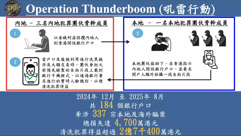 警方調查發現有犯罪集團從內地招攬人士到香港,於數字銀行開設銀行戶口,再要求開戶人士拍攝一段自拍短片交予內地同黨,用以操控傀儡戶口作人臉識別驗證之用,從而操控戶口洗黑錢。