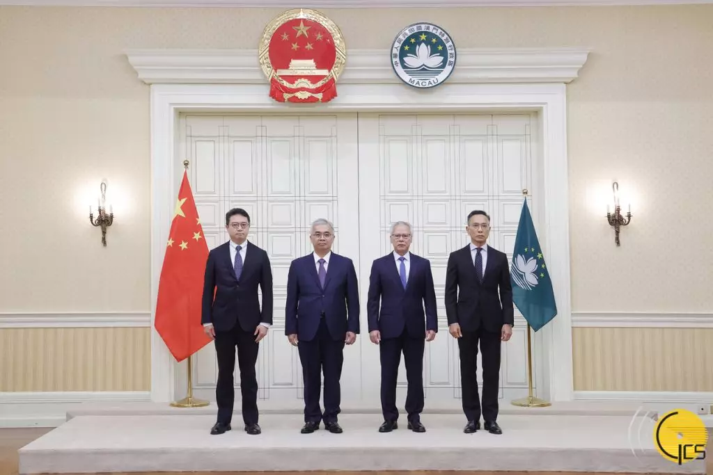 行政長官岑浩輝與新任行政法務司司長黃少澤、新任保安司司長陳子勁、新任檢察院檢察長唐曉峰合影。澳門政府新聞局圖片