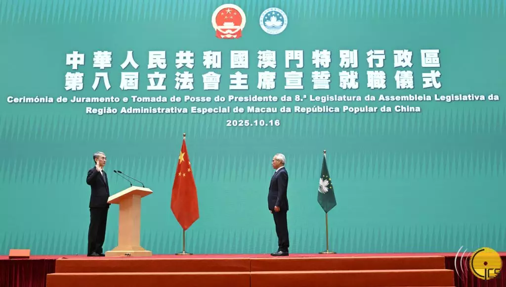 行政長官岑浩輝為宣誓就職的澳門特別行政區第八屆立法會主席張永春監誓。澳門政府新聞局圖片