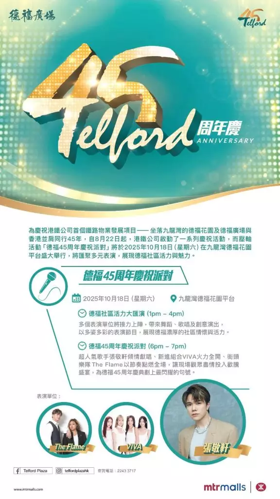 為慶祝港鐵首個鐵路物業發展項目——德福花園及德福廣場落成45周年,壓軸活動「德福45周年慶祝派對」將於本週六(10月18日)在九龍灣德福花園平台盛大舉行。活動由下午1時起展開連串精彩演出,並於晚上6時迎來人氣歌手張敬軒、新進女子組合VIVA及街頭樂隊The Flame等傾力演出,與市民共度歡樂時刻。