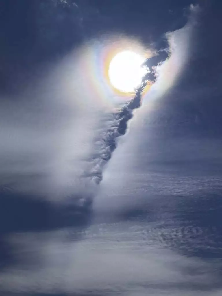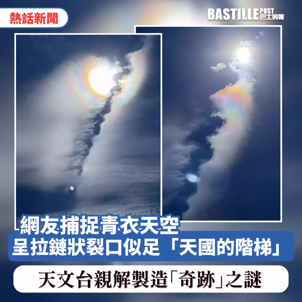 有網民日前在青衣拍攝到天空奇景,相片中的天空如拉鏈狀裂開,這一獨特現象猶如「天國的階梯」。而天文台以「邁向虹彩的天梯」為題,詳細解釋這道美景的成因,指出這是「消散尾跡」與「虹彩雲」共同作用的結果。