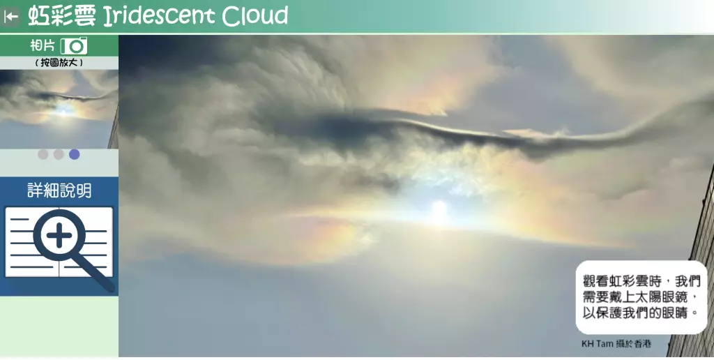 為了讓大家更加深入了解此現象,天文台又特別為大家展示究竟何為「消散尾跡」和「虹彩雲」。其中「消散尾跡」是指飛機飛過雲層後,蒸發或凝結雲水滴而造成一道無雲縫隙。。觀測虹彩雲時,天文台提醒市民需佩戴太陽眼鏡保護眼睛,以 安全欣賞這道轉瞬即逝的自然 奇景。