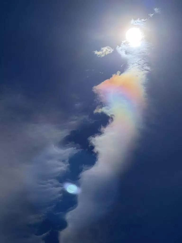 天文台解釋,與大眾熟悉的飛機雲(凝結尾跡)不同,消散尾跡形成於飛機飛過又薄又闊的雲層時,其排放的熱氣蒸發雲層中的水滴,造成一道白雲被劃破的痕跡。同時陽光穿過雲層水滴產生繞射作用,形成虹彩雲的特殊光學現象,兩者結合創造出這幅令人驚嘆的天空畫卷。