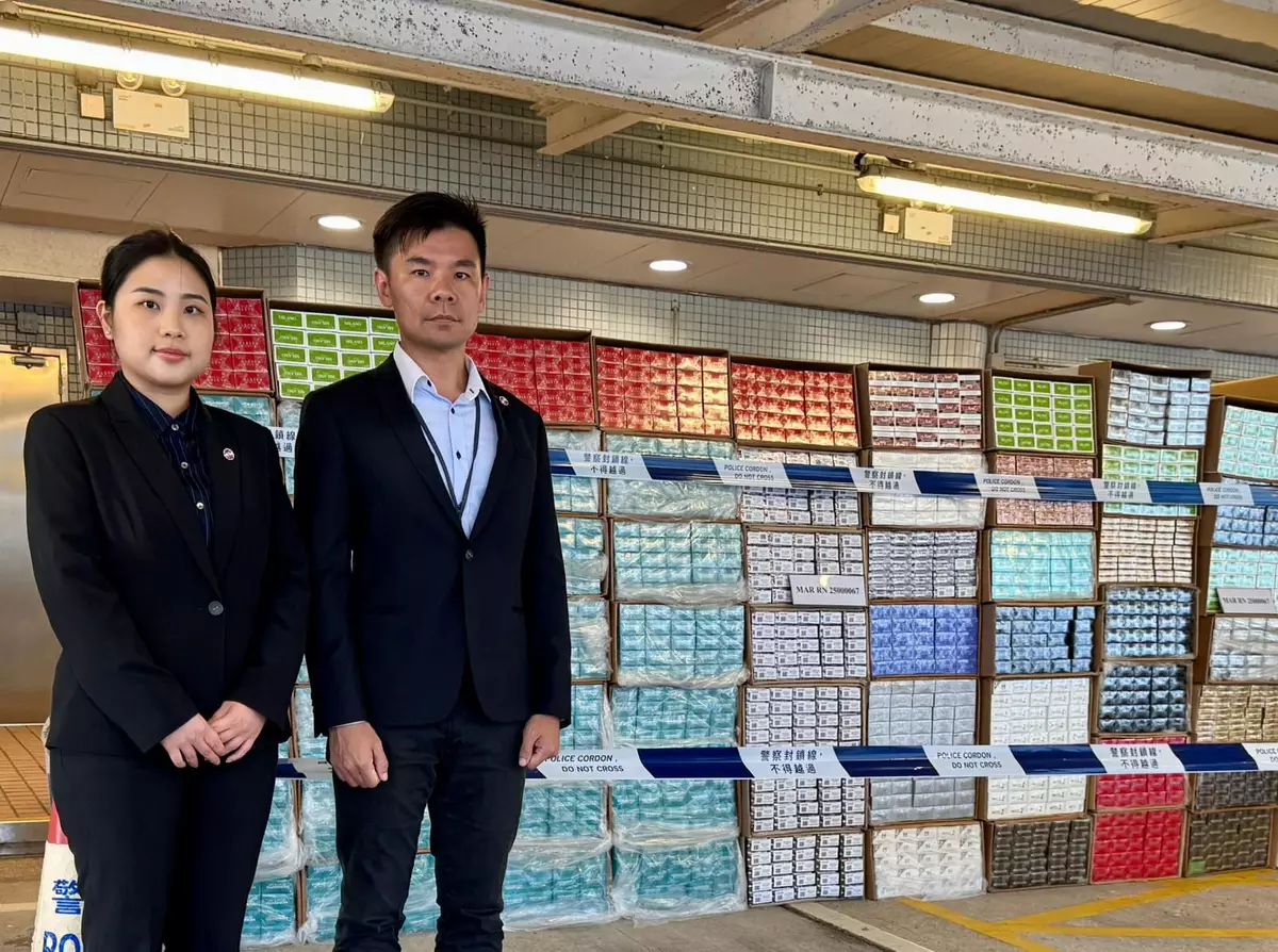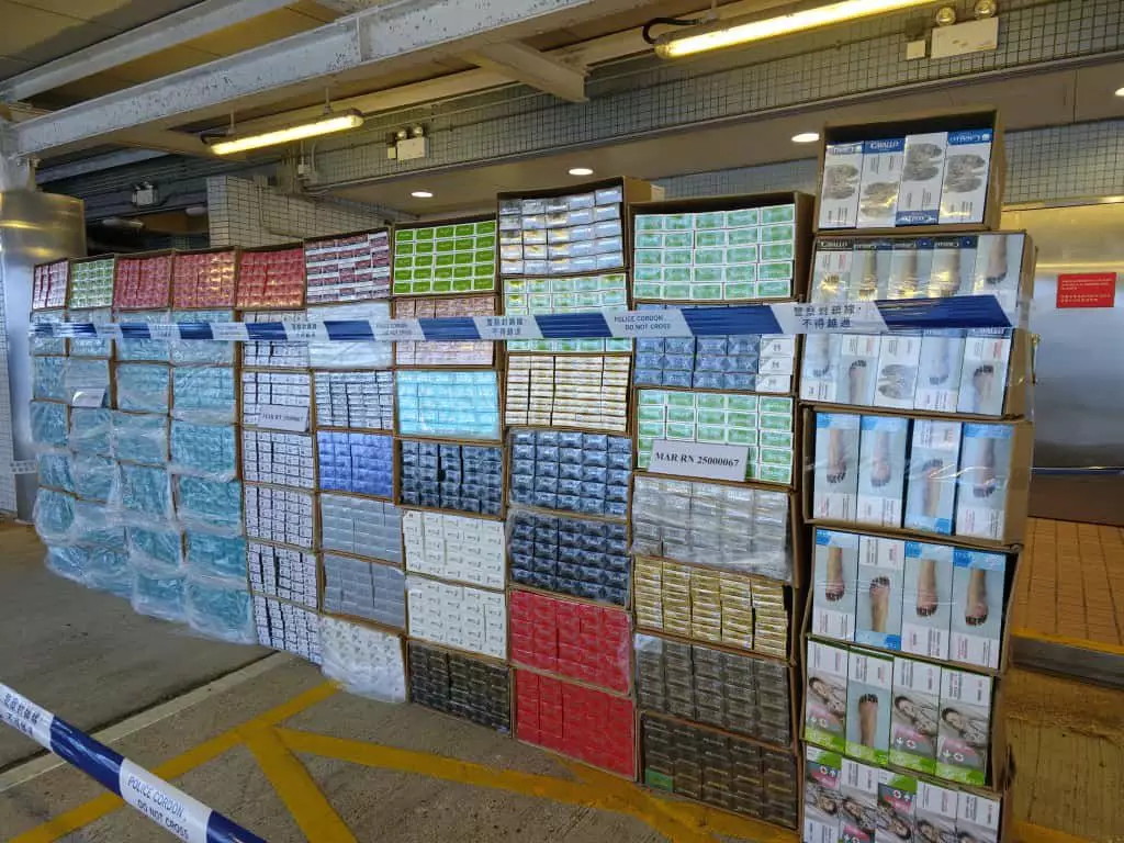 關指經深入調查後,水警總區刑事部昨日(10月15日)下午聯同水警總區小艇隊人員,在東九龍一帶展開代號為「雷霆2025」行動,搗破兩個分拆私煙中轉站,它們分別位於油塘一個商場停車場,以及一個位於新蒲崗一座工業大廈內的月租停車場,檢獲共984000支未完稅香煙,估計市值港幣517萬元,應課稅總額為港幣325萬元,並以管有或處理未完稅香煙罪名拘捕4名涉案本地男子,他們年齡介乎50至55歲,部分被捕人士有三合會背景。