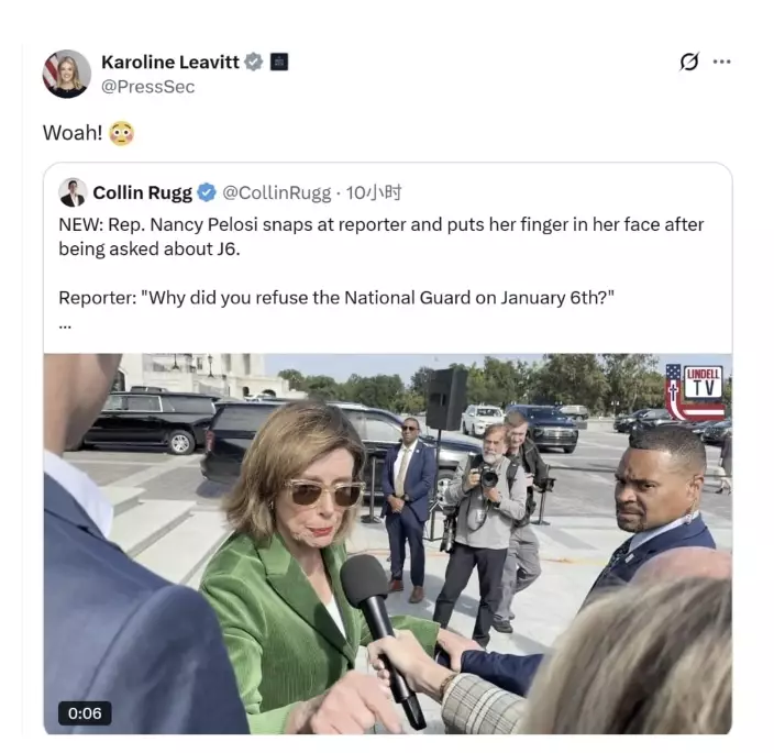 「林德爾電視台」拍到佩洛西這副惡型惡相的嘴臉,自然第一時間在X平台上發佈了這段視頻,白宮新聞秘書萊維特及特朗普陣營的媒體與政客隨即轉發。萊維特轉發帖子時還來了一句「哇哦」。