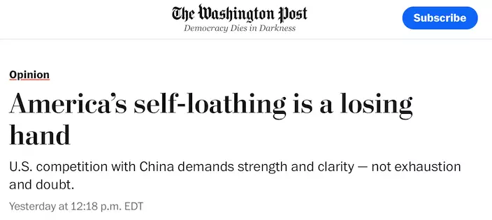《華盛頓郵報》近日刊登哈德遜研究所學者戴維·費斯(David Feith)的文章,主題是「美國要與中國競爭,得先重拾信心」。這篇文章的出發點很有代表性:當「中國威脅論」已被喊了多年,真正困擾美國的,也許不是中國,而是自己。