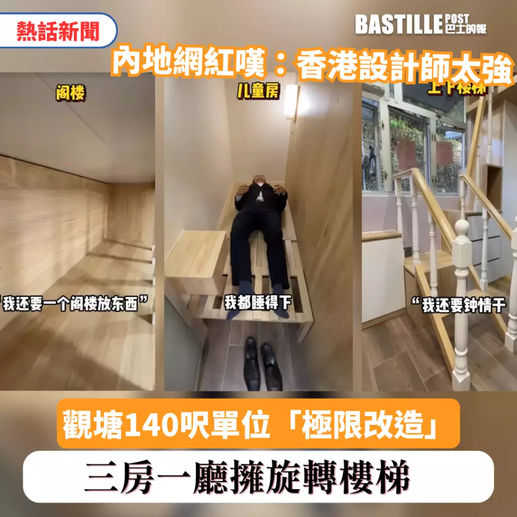 香港地少人多,居住空間狹小早已不是新聞,但觀塘一個僅140平方呎(約13平方米)的單位,竟被改造成三房一廳一廚一衛,還設有一條豪宅式旋轉樓梯,影片在內地社交平台瘋傳。
