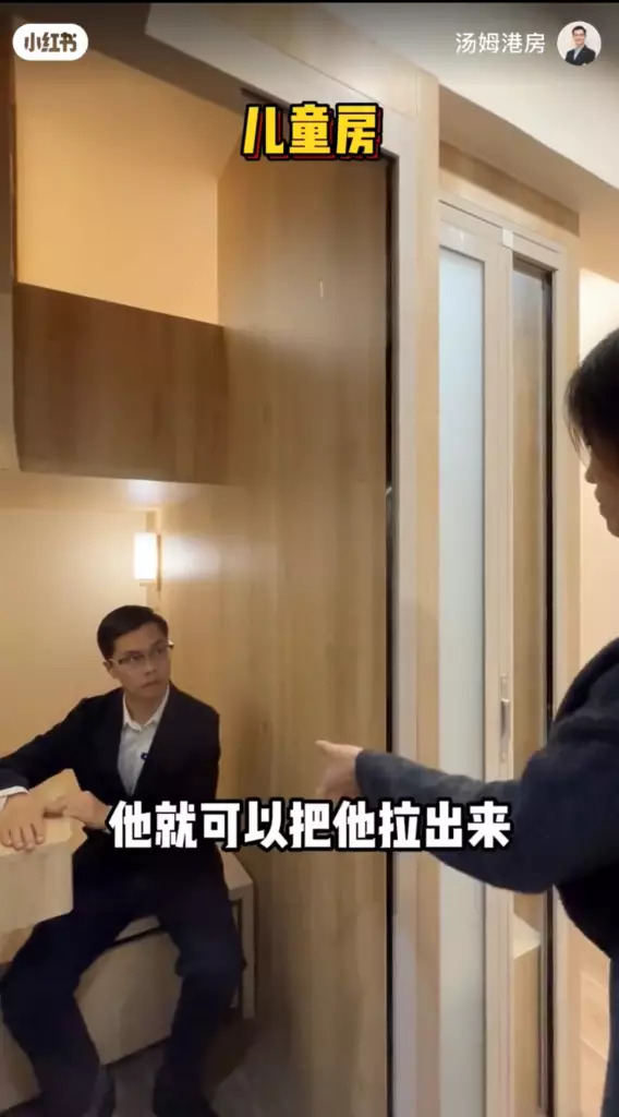 影片中可見,小孩房需通過推拉門進出,內設書桌與床架,空間緊湊到「一毫米都不能多」,否則無法開門。12歲的小孩需睡在狹小區域,床板下還設有儲物抽屜。閣樓主人房雖可放雙人床,但樓梯陡峭且容易撞頭,第三個睡眠區則位於閣樓下方,需以摺疊梳化或地鋪形式使用。