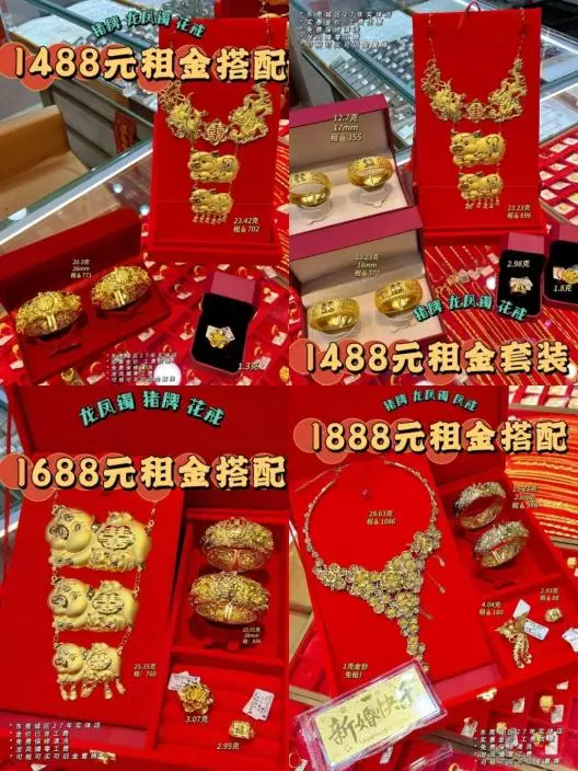 據內媒報導稱,剛舉辦婚禮的陳女士說,她通過珠寶租賃平台,租了一套總克重超50克的重工黃金首飾,花費不到1000元人民幣。