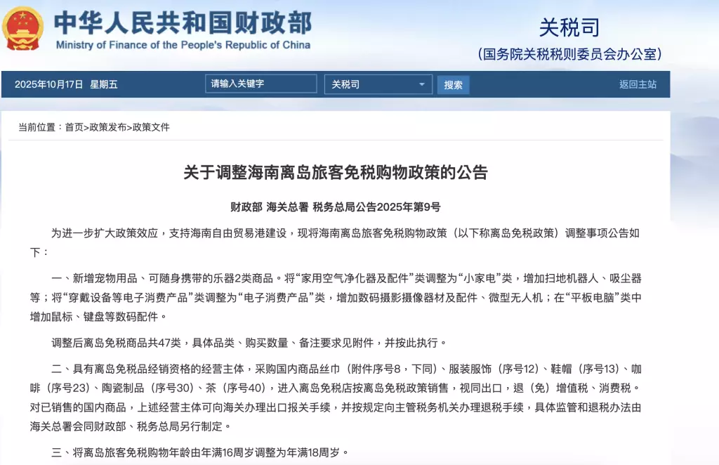 財政部、海關總署、稅務總局聯合印發公告,下月起調整海南離島旅客免稅政策,首次明確允許「離島且離境旅客」享受免稅政策,覆蓋國內外旅客和海南省居民。另外,每名海南居民在一年內有離島紀錄,可按有關要求,不限次數購買離島免稅商品。