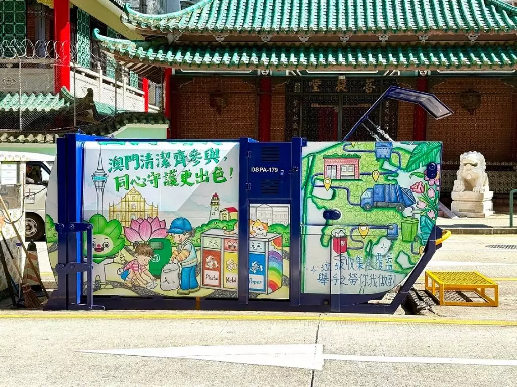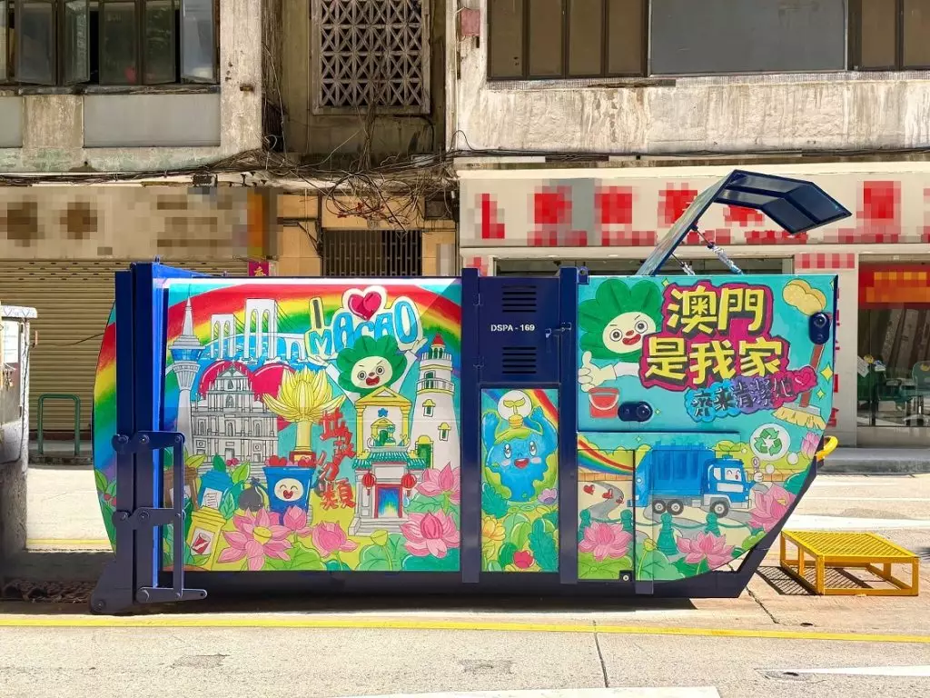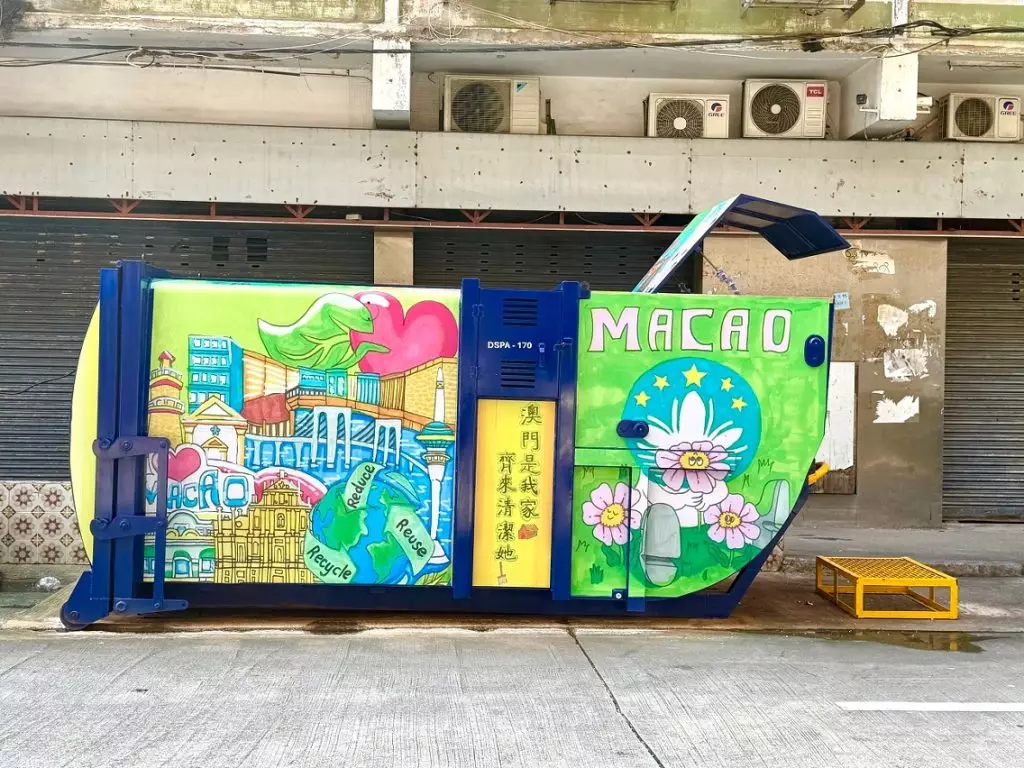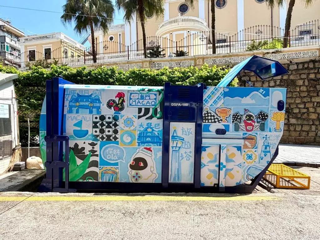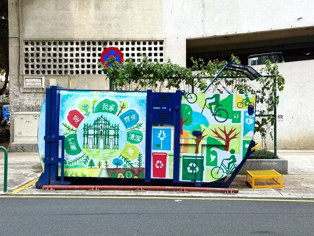 小組冠軍作品應用於街道上的壓縮式垃圾桶桶身。澳門政府新聞局圖片