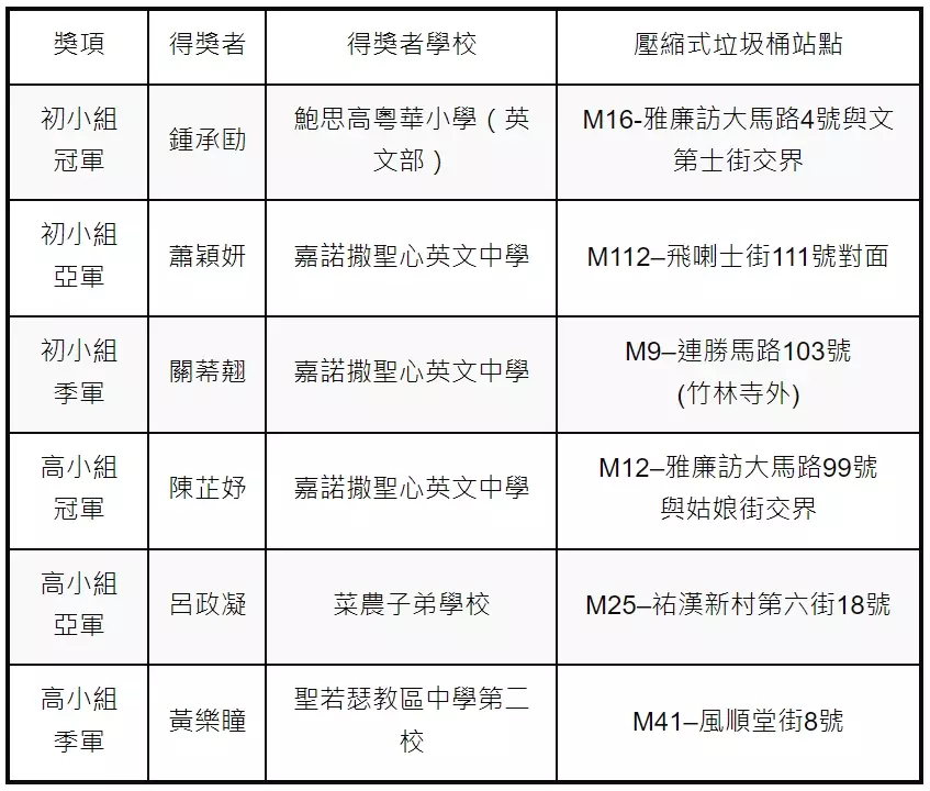 壓縮式垃圾桶飾面設計比賽早前已順利舉行,市政署將初小組及高小組的冠、亞、季軍共六幅作品製成飾面膠貼,裱貼於街道上的壓縮式垃圾桶桶身,為壓縮桶換上新“衣裳”,改善垃圾收集設施在大眾心中的刻板印象,亦為城市增添色彩。同時,藉呈現學童的創意設計,鼓勵公眾愛護公共設施、關注環境衛生,共建美潔城市。