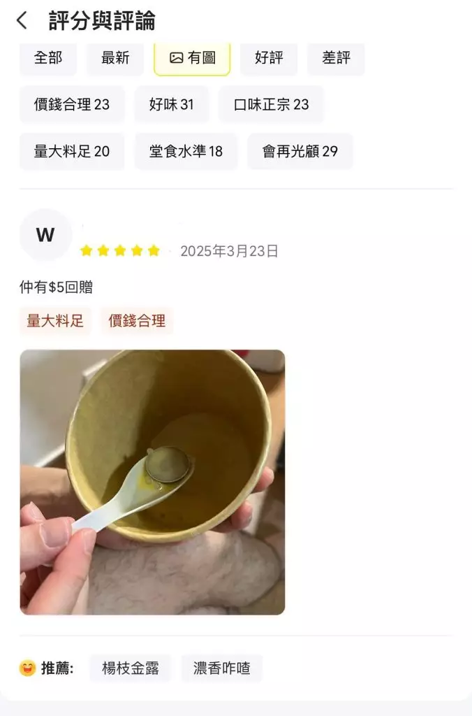日前有食客在糖水舖外賣楊枝甘露,大快朵頤後,竟在碗底撈出一枚5元硬幣,錯愕之餘,事主竟然在網上給予店舖五星好評,此舉引發網民熱議。該名「幸運顧客」在網上留言「仲有$5回贈」,並盛讚糖水「量大料足」、「價錢合理」,而其附圖顯示,碗底中除了西米外,還有一枚閃亮的硬幣。