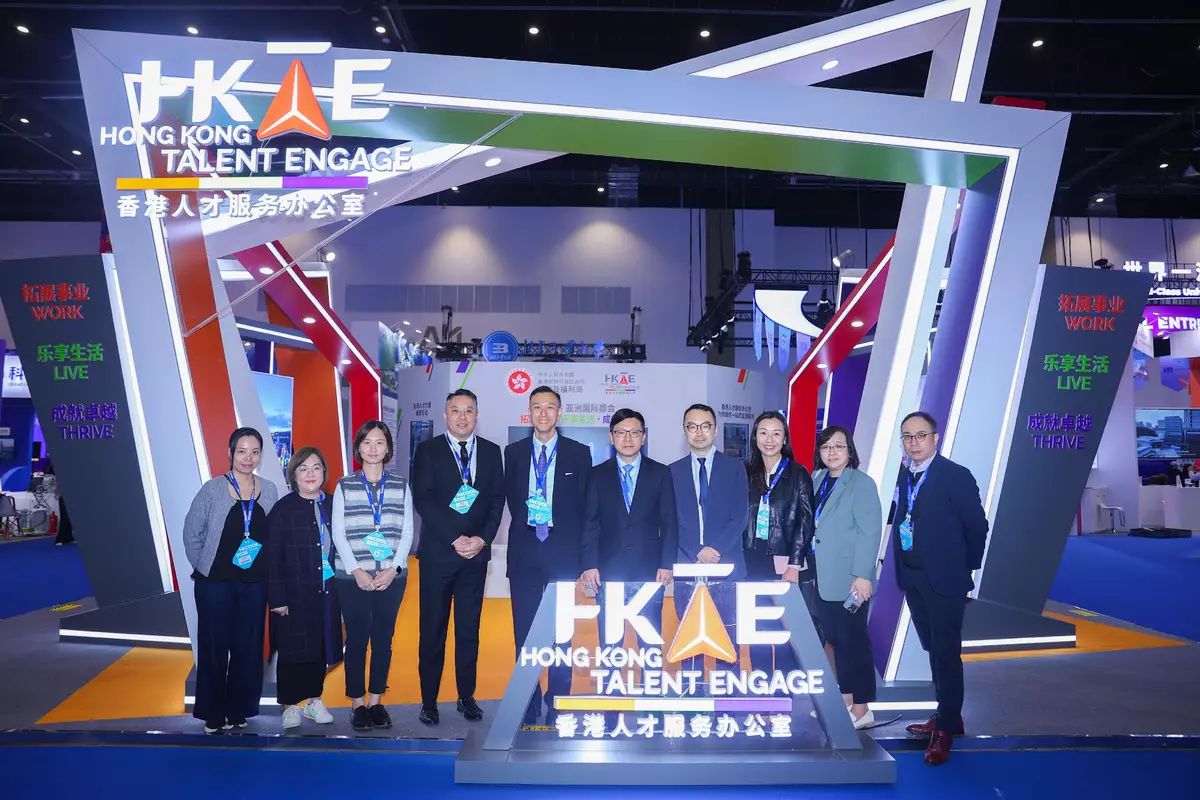 孫玉菡(右五)和陳海勁(左五)到訪人才辦於HICOOL 2025全球創業者峰會設立的展位,並與香港人才創業者協會執行主席劉暢(右四)會面。 政府新聞處圖片