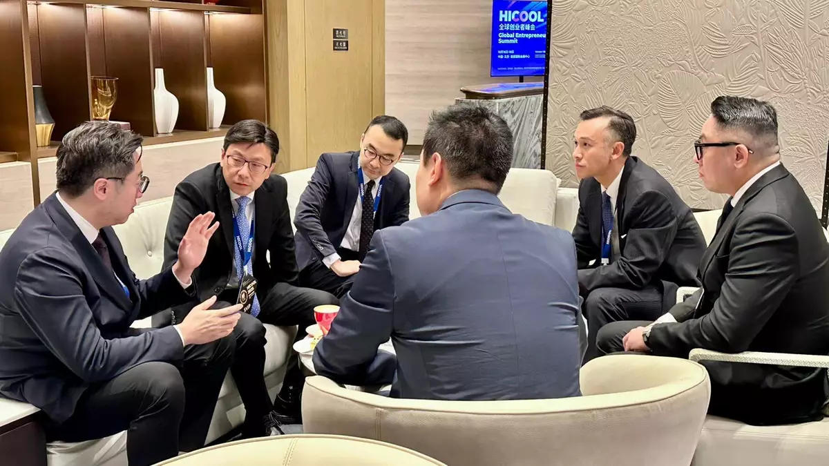 孫玉菡(左二)和陳海勁(右二)與HICOOL 2025全球創業者峰會的香港參展企業代表茶敘,了解他們對人才發展的看法。 政府新聞處圖片