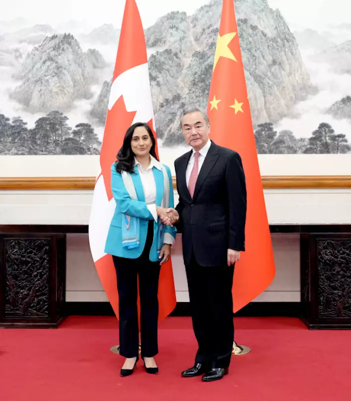 中共中央政治局委員、外交部長王毅在北京同加拿大外長阿南德會談。