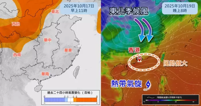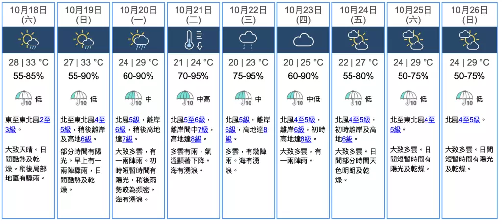 展望星期日北風逐漸增強,隨後數日風勢持續頗大,漸轉多雲有雨,市區氣溫顯著下降至20度左右,新界再低兩三度,晚間部分沿岸低窪地區可能出現水浸。天文台指,隨著「風神」的環流逐漸影響廣東沿岸,天文台屆時或會直接發出3號強風信號,取代強烈季候風信號,而不會發出一號戒備信號。