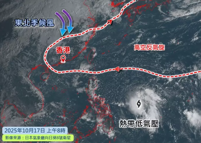 天文台表示,高空反氣旋正為廣東帶來普遍晴朗的天氣。同時,華中的氣壓正在上升,預料一股強烈東北季候風會在星期六晚至星期日逐漸影響華南。