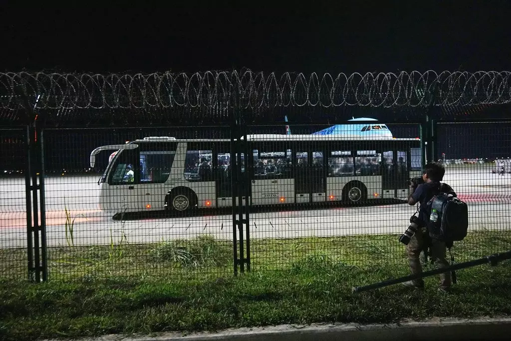 柬埔寨因為從事犯罪活動而被移民當局拘押的64名南韓公民,早上乘包機回國。AP圖片