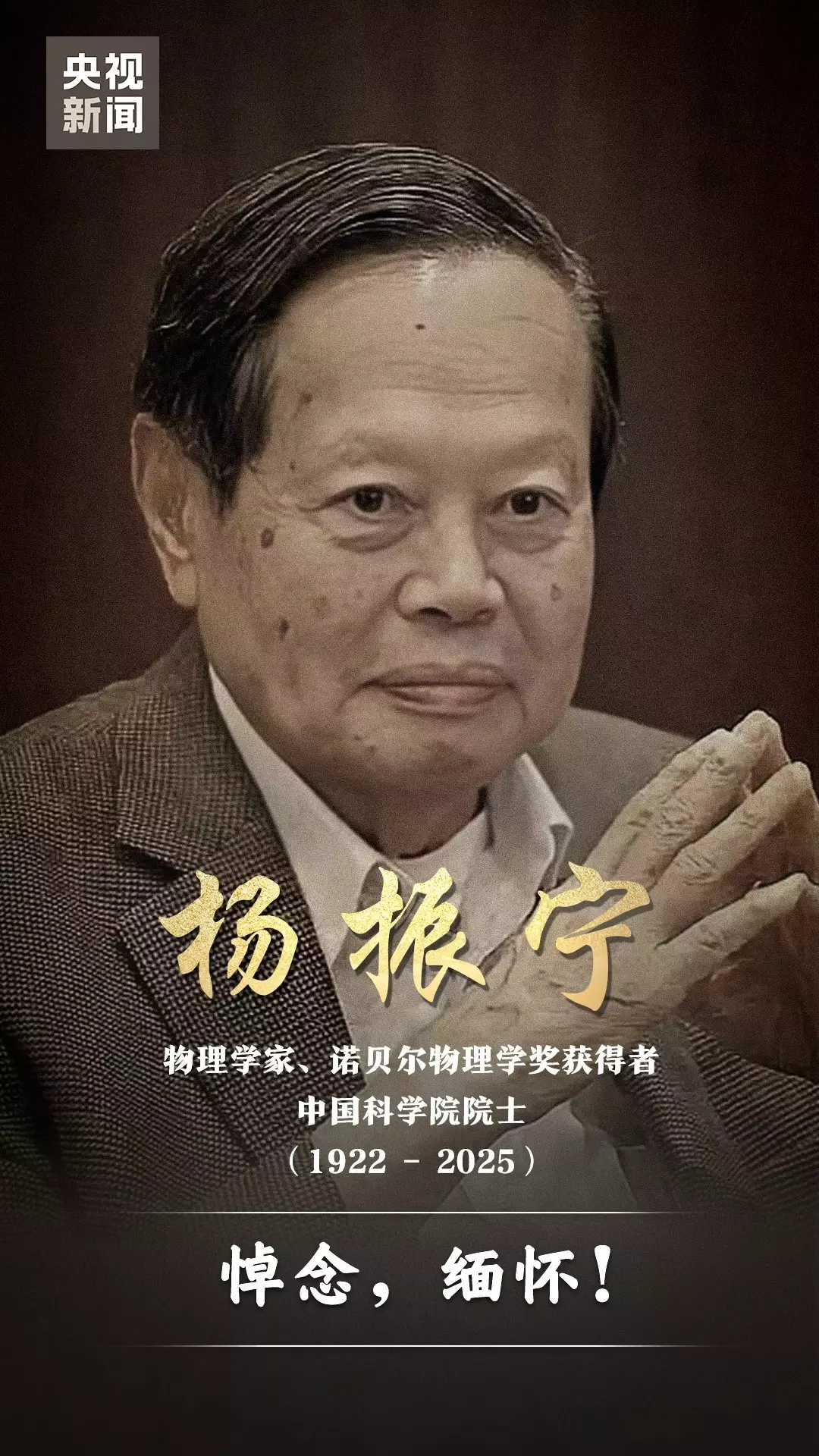 諾貝爾物理學獎得主楊振寧病逝,享年103歲。央視微博圖片