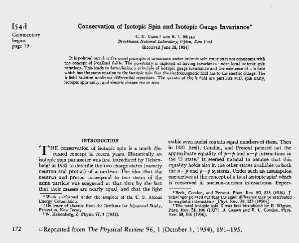 1954年楊振寧與米爾斯關於非阿貝爾規範場的論文