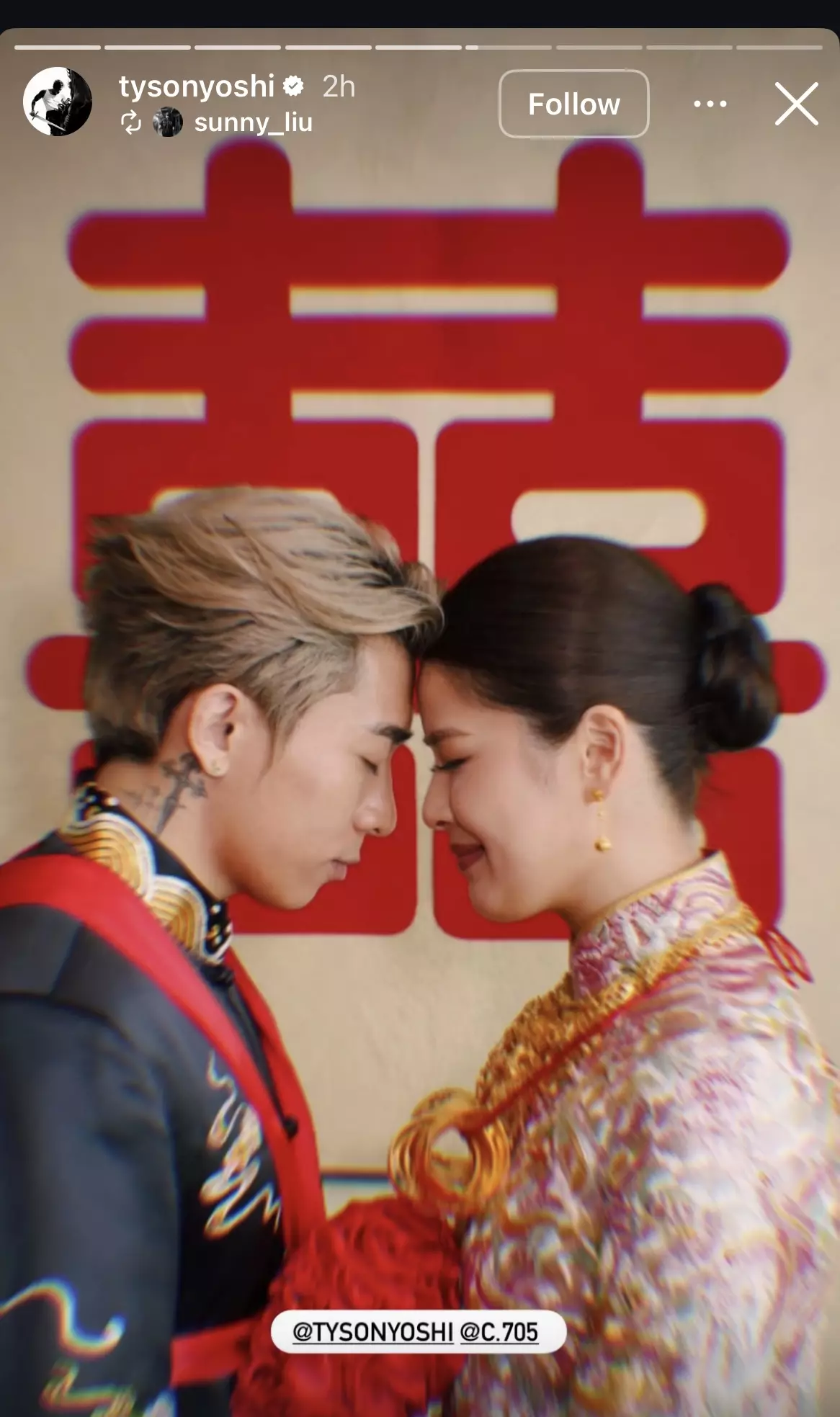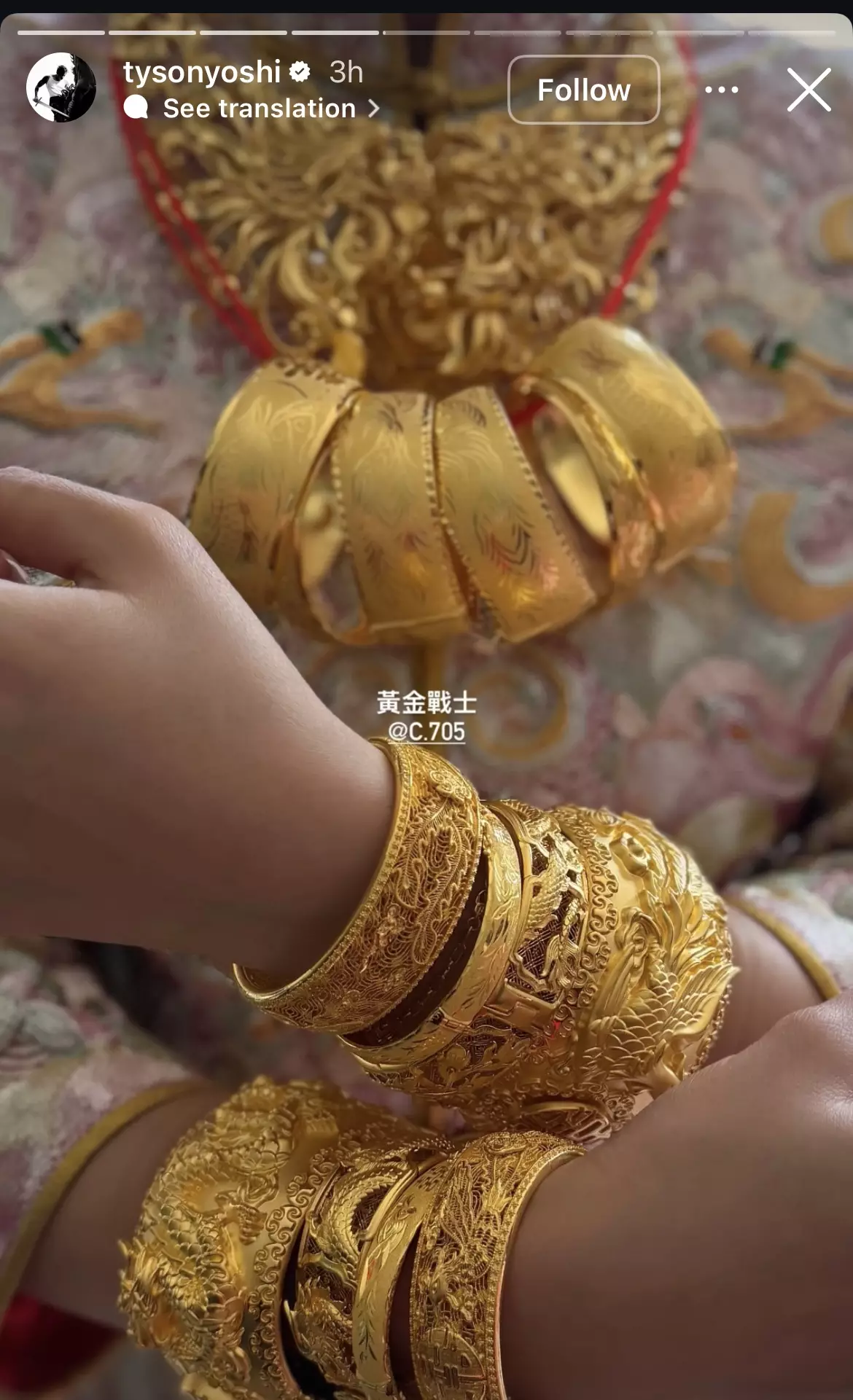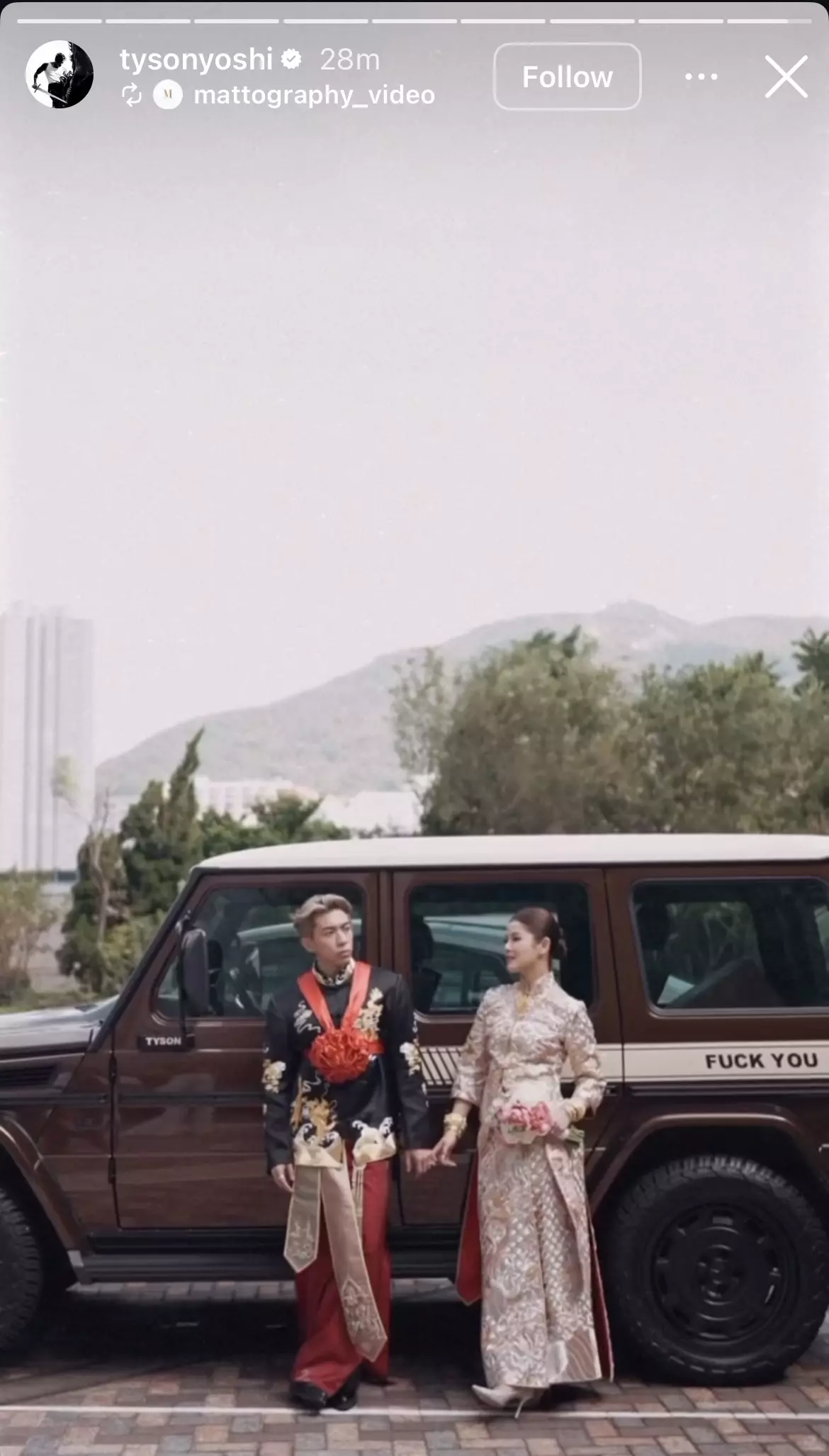 歌手Tyson Yoshi(程浚彥)與老婆Christy於今日(10月18日)在香港補辦傳統中式婚宴。Christy身穿最高級別的「褂皇」裙褂,佩戴逾十對龍鳳鈪及多件金器,全身金光閃耀,被老公Tyson笑稱是「黃金戰士」。