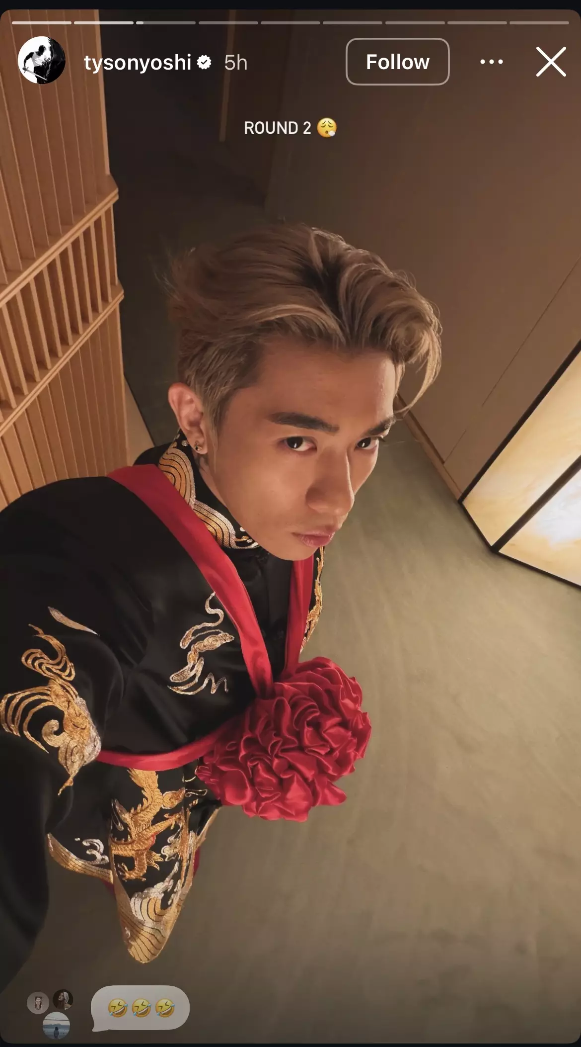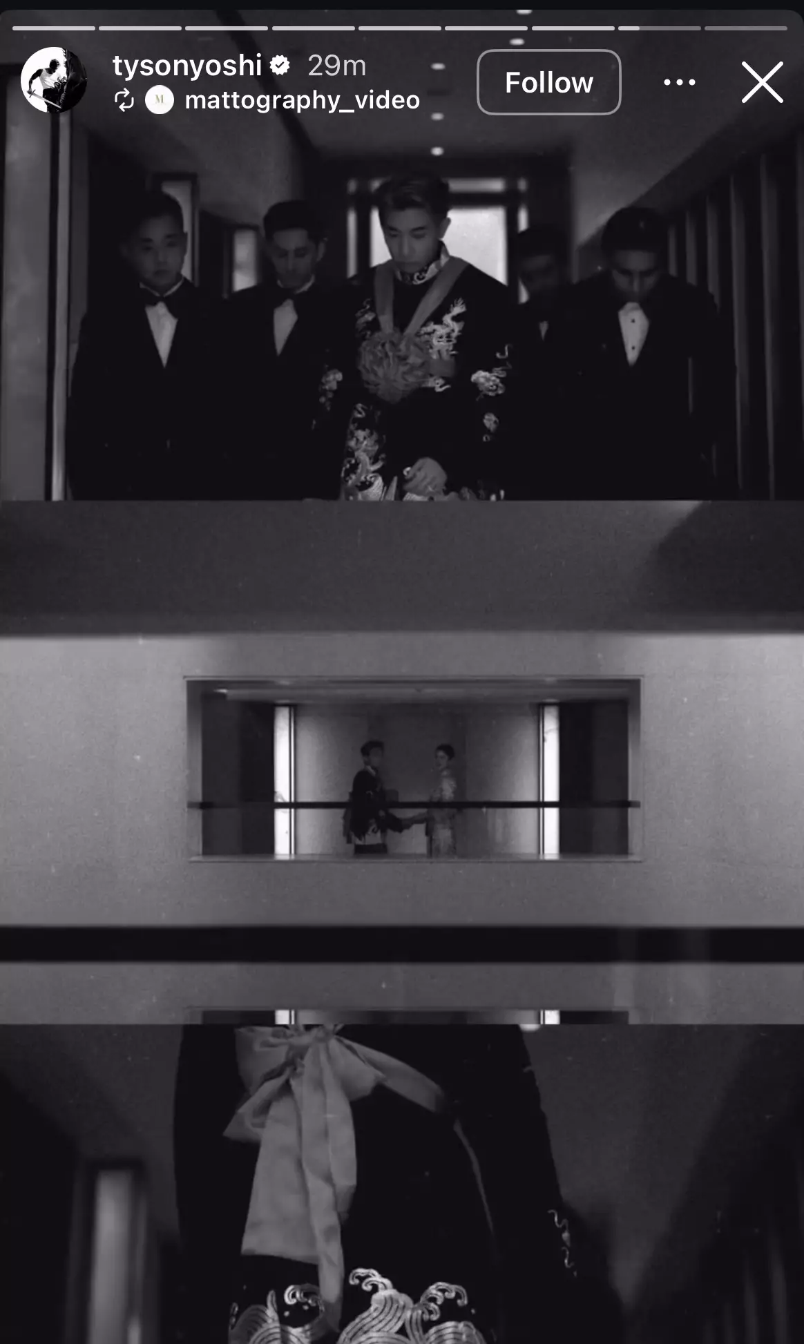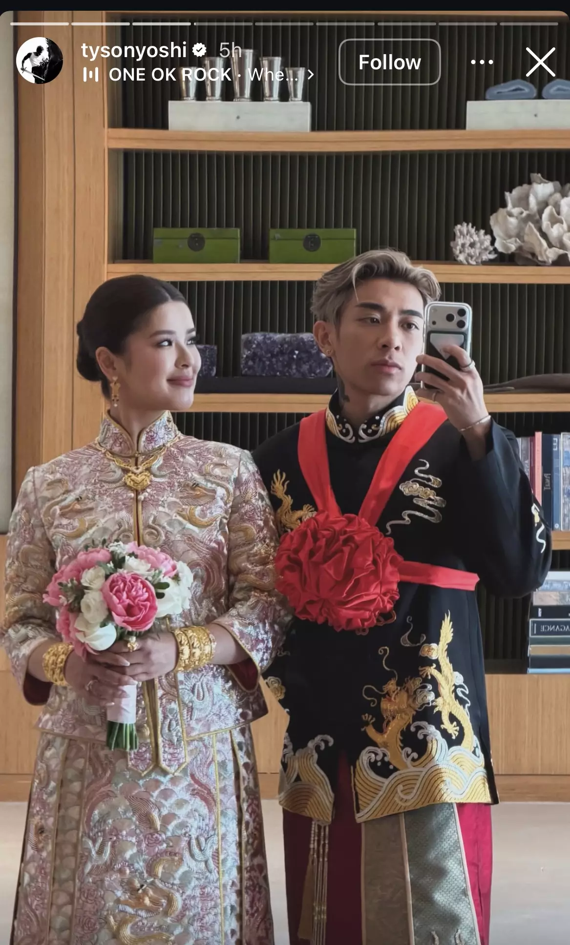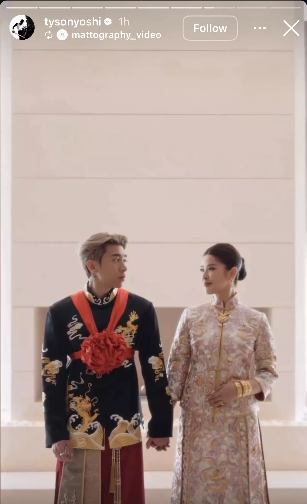 歌手Tyson Yoshi(程浚彥)與老婆Christy於今日(10月18日)在香港補辦傳統中式婚宴。Christy身穿最高級別的「褂皇」裙褂,佩戴逾十對龍鳳鈪及多件金器,全身金光閃耀,被老公Tyson笑稱是「黃金戰士」。