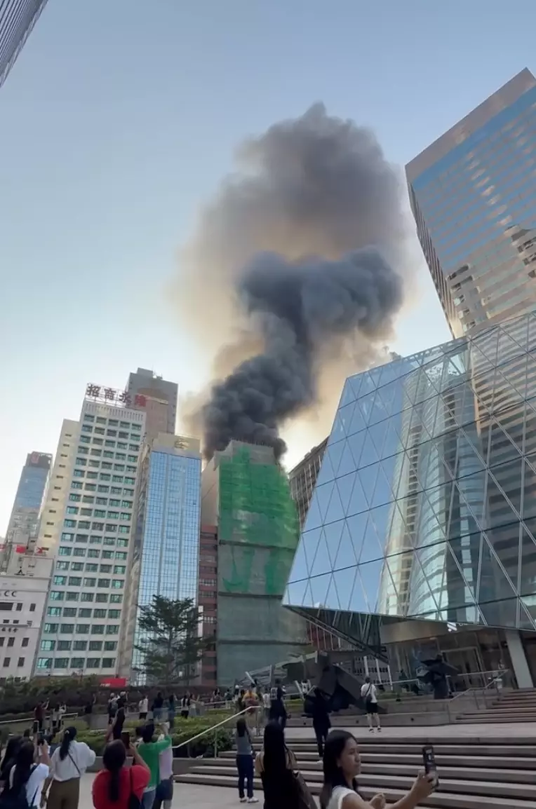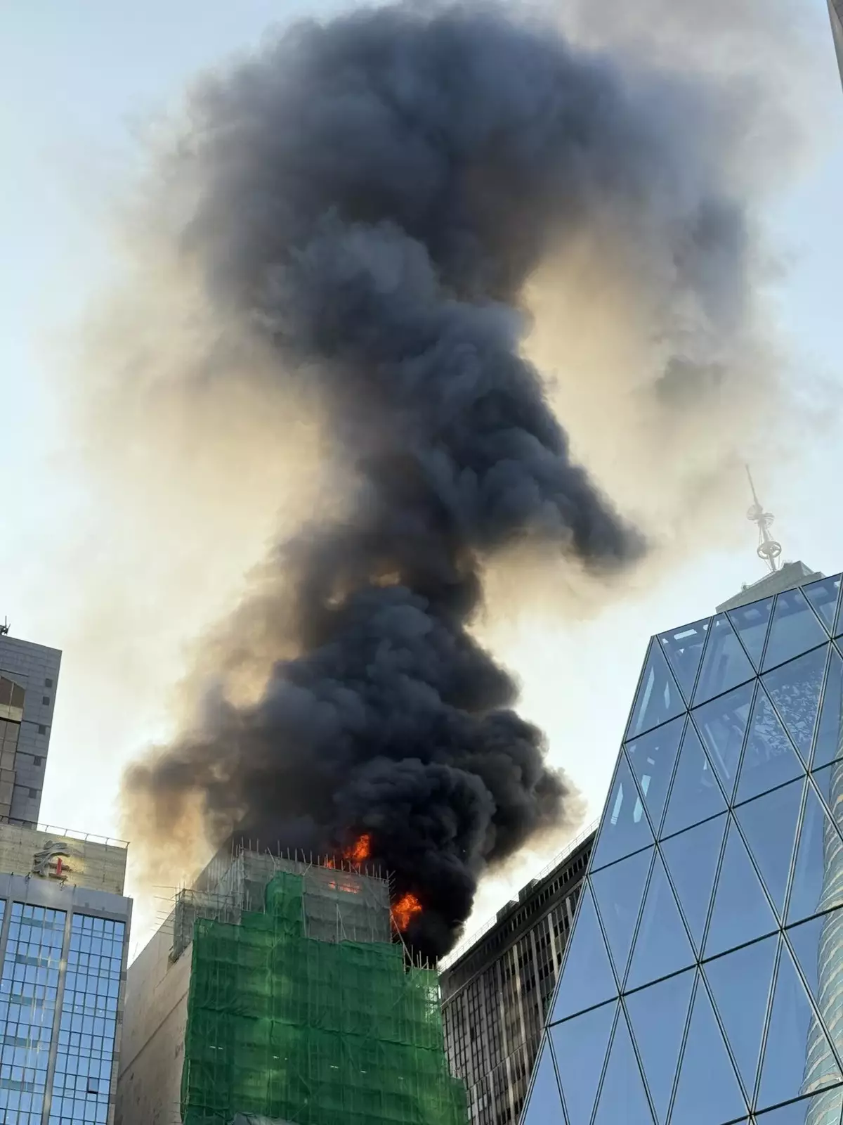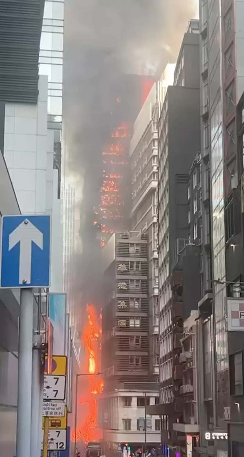 中環干諾道中34號被掤架包圍的華懋大廈,下午4時許發生火警,火勢沿棚架向上,整橦大廈外牆陷入火海之中,更一度傳出爆炸聲,據報有3人被困升降機内,消防救出多名傷者和市民。初步有1男1女送院,兩人清醒。