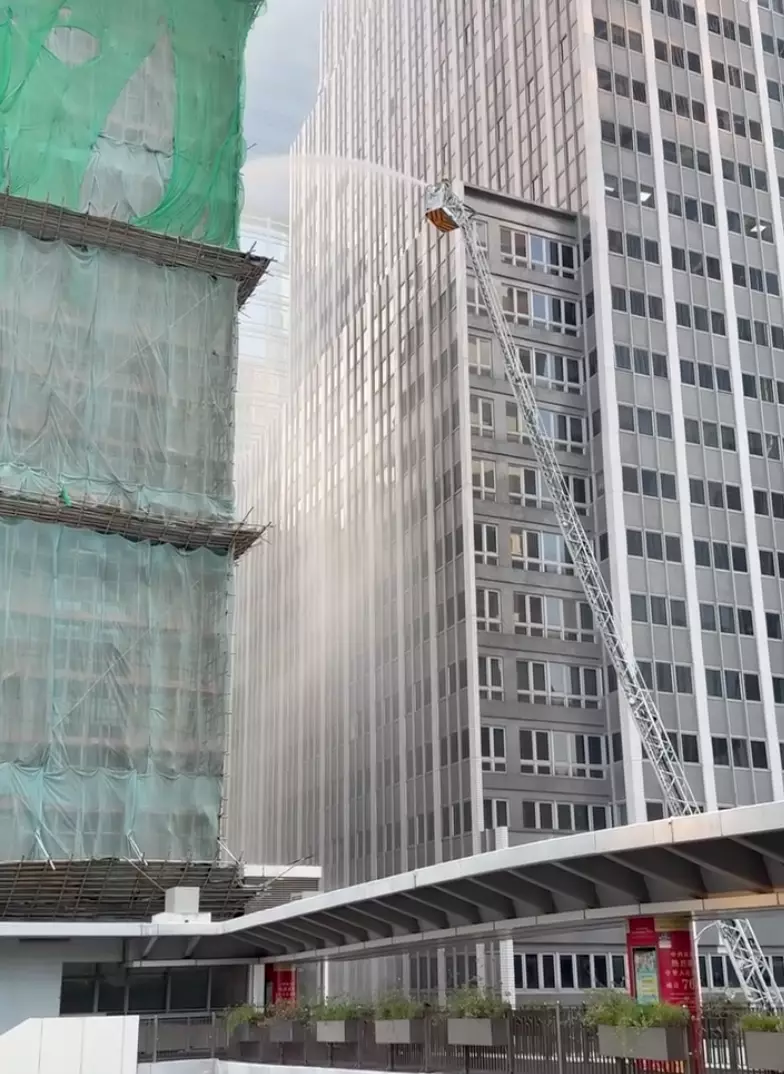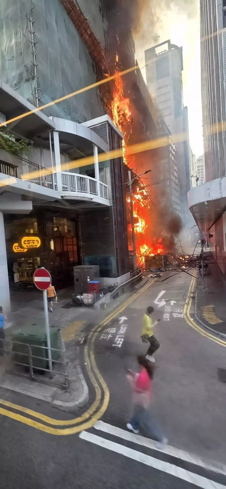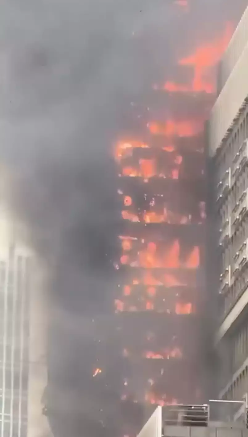 中環干諾道中34號被掤架包圍的華懋大廈,下午4時許發生火警,火勢沿棚架向上,整橦大廈外牆陷入火海之中,更一度傳出爆炸聲,據報有3人被困升降機内,消防救出多名傷者和市民。初步有1男1女送院,兩人清醒。