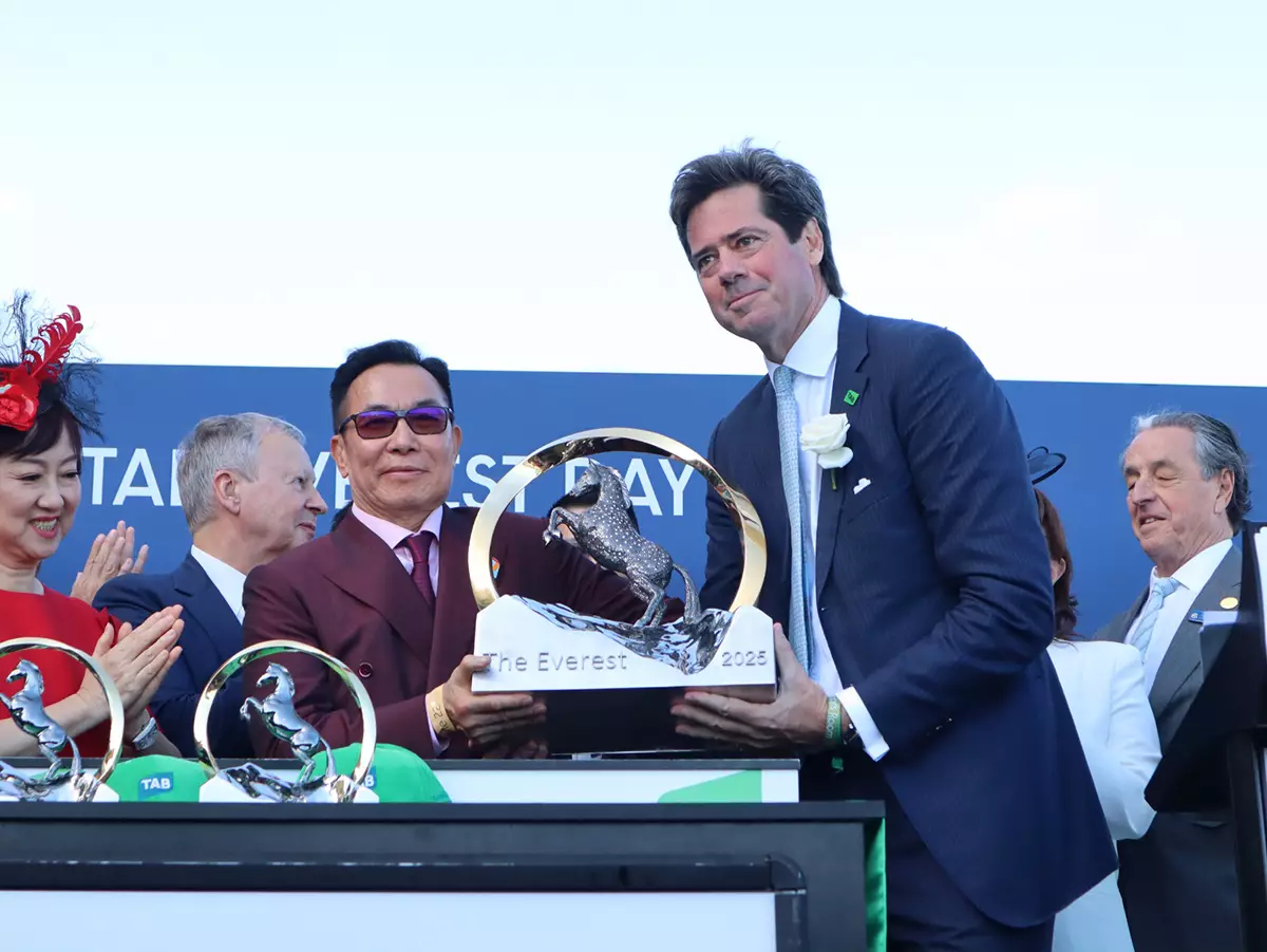 「嘉應高昇」的馬主團體代表梁錫光,在頒獎禮上接過珠穆朗瑪峰錦標冠軍獎盃。