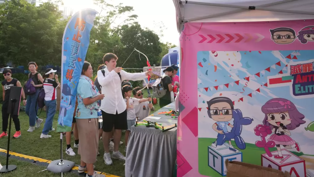 攤位遊戲吸引市民體驗射箭挑戰,學習防罪知識。巴士的報記者攝
