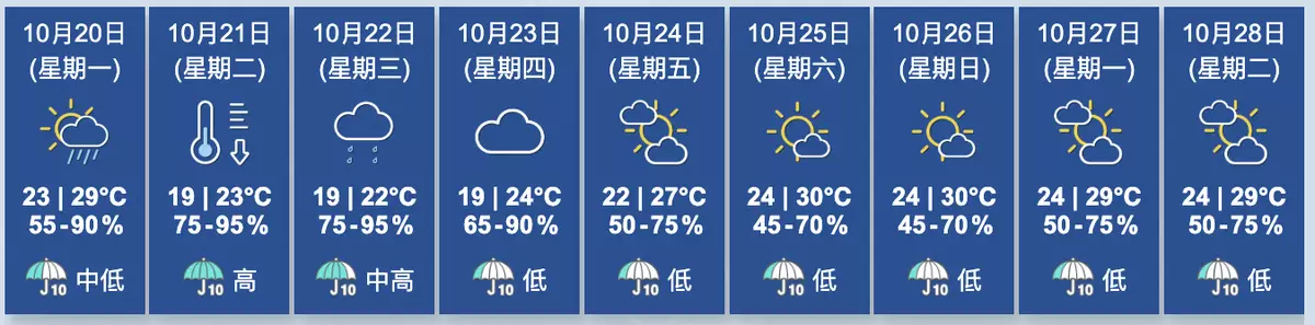 在風神及季候風的共同影響下,未來數日本港風勢持續頗大,漸轉多雲有雨,星期二及星期三初時雨勢有時較為頻密,星期二至星期四市區氣溫會顯著下降至19度左右,新界再低兩三度。