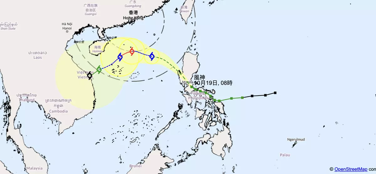 預料熱帶氣旋「風神」會在星期日晚進入本港800公里範圍內。隨著「風神」在星期一(10月20日)逐漸靠近廣東沿岸,天文台會考慮在星期一黃昏前後直接發出3號強風信號,取代強烈季候風信號。